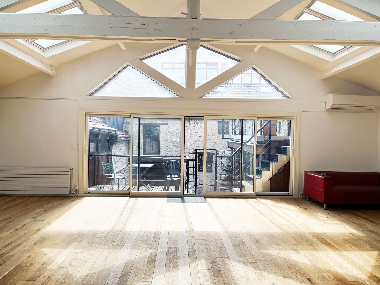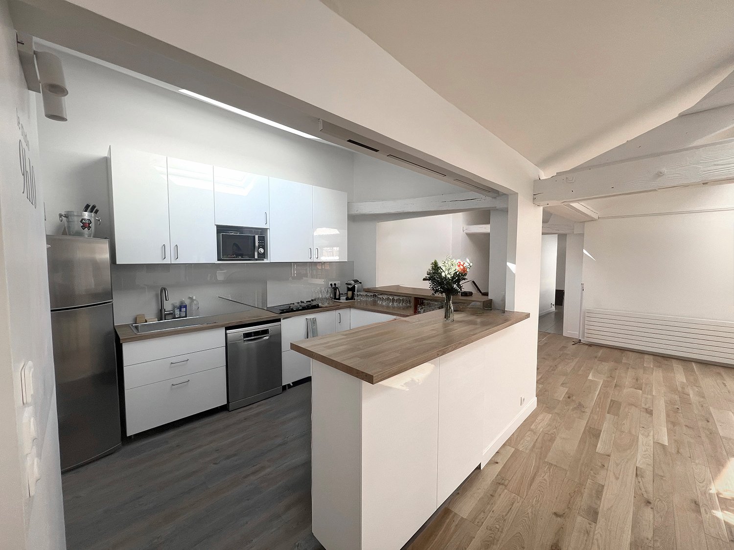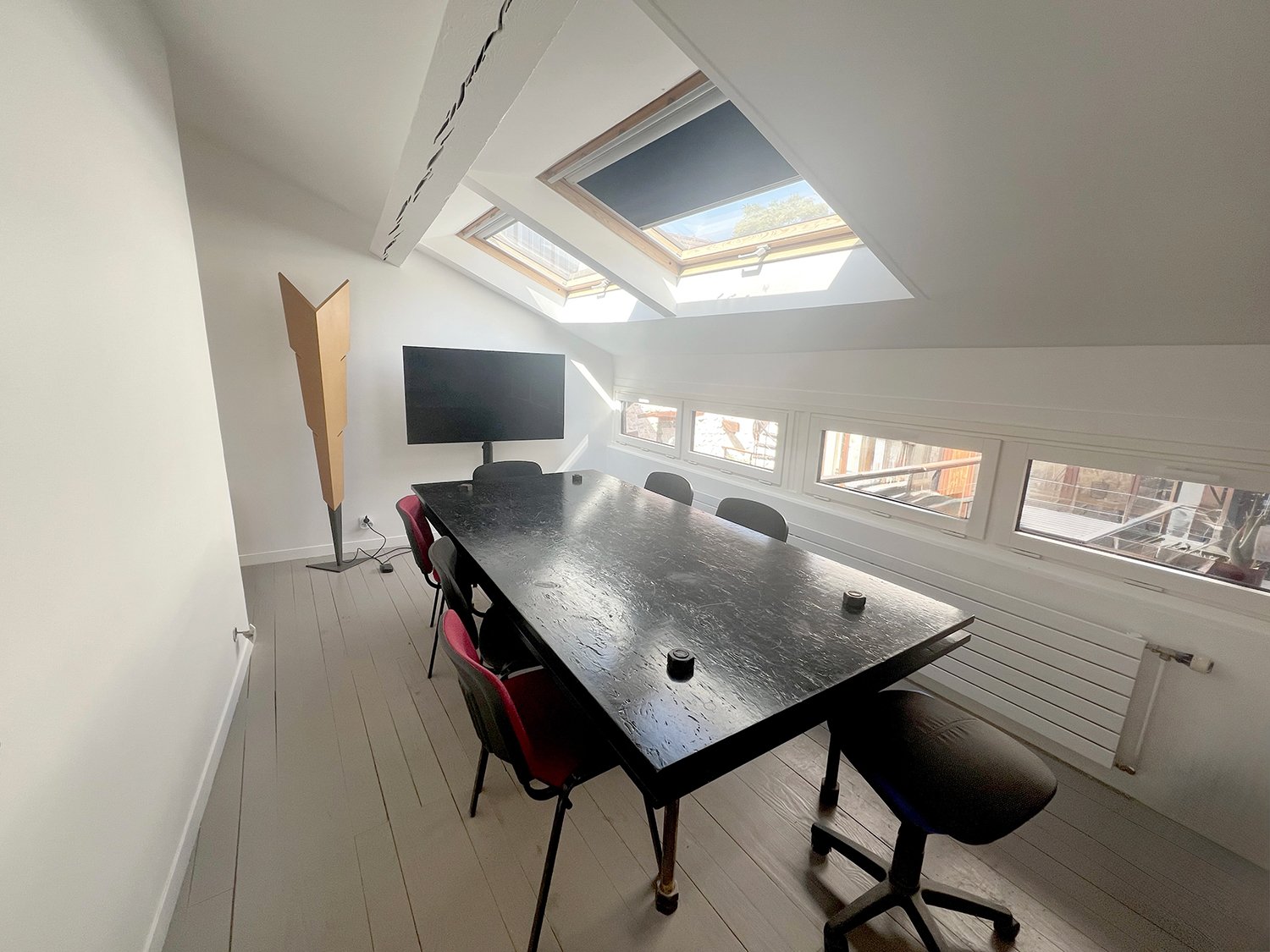 Plateau lumière du jour occultable de 80m2, disposant d’une cuisine entièrement équipée, d’une loge avec douche, d’une salle de réunion, d’un accès aux terrasses.